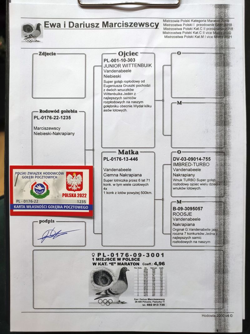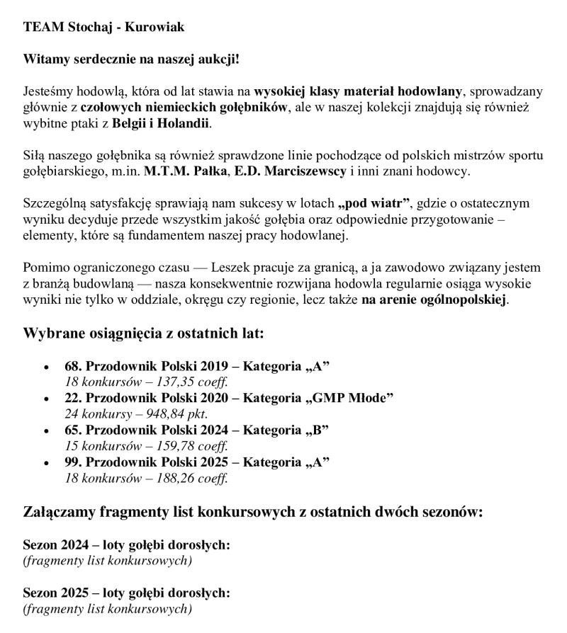 Oryginalny gołąb z hodowli E. i D. Marciszewscy, z gołębnika Team Sochaj-Kurowiak. Szczegóły pochodzenia w rodowodzie. Więcej informacji pod nr tel.: 608 636 232 (Leszek), 661 298 434 (Szymon) *koszty transportu 150 zł, istnieje również możliwość odbioru wylicytowanych ptaków na wystawie w Katowicach
