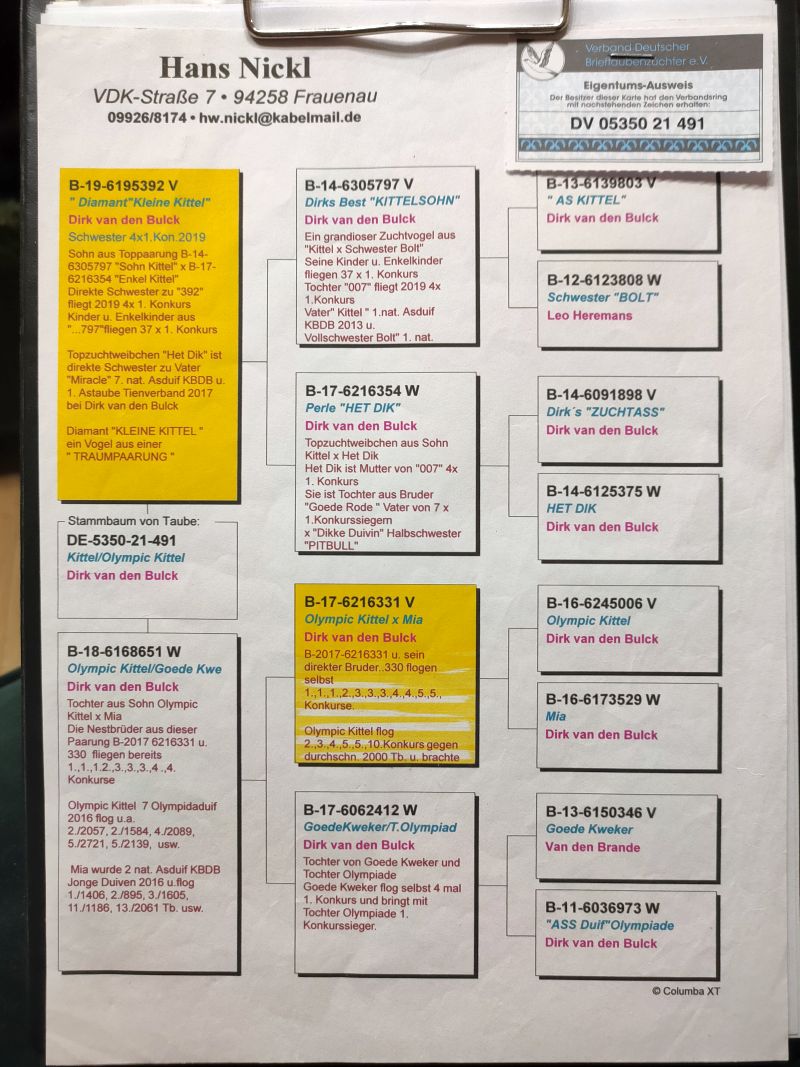 Oryginalny gołąb z hodowli H. Nickl, z gołębnika Team Sochaj-Kurowiak. Szczegóły pochodzenia w rodowodzie. Więcej informacji pod nr tel.: 608 636 232 (Leszek), 661 298 434 (Szymon) *koszty transportu 150 zł, istnieje również możliwość odbioru wylicytowanych ptaków na wystawie w Katowicach