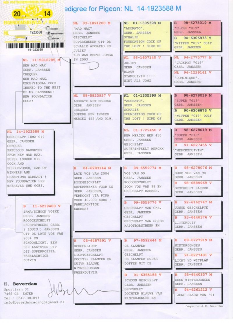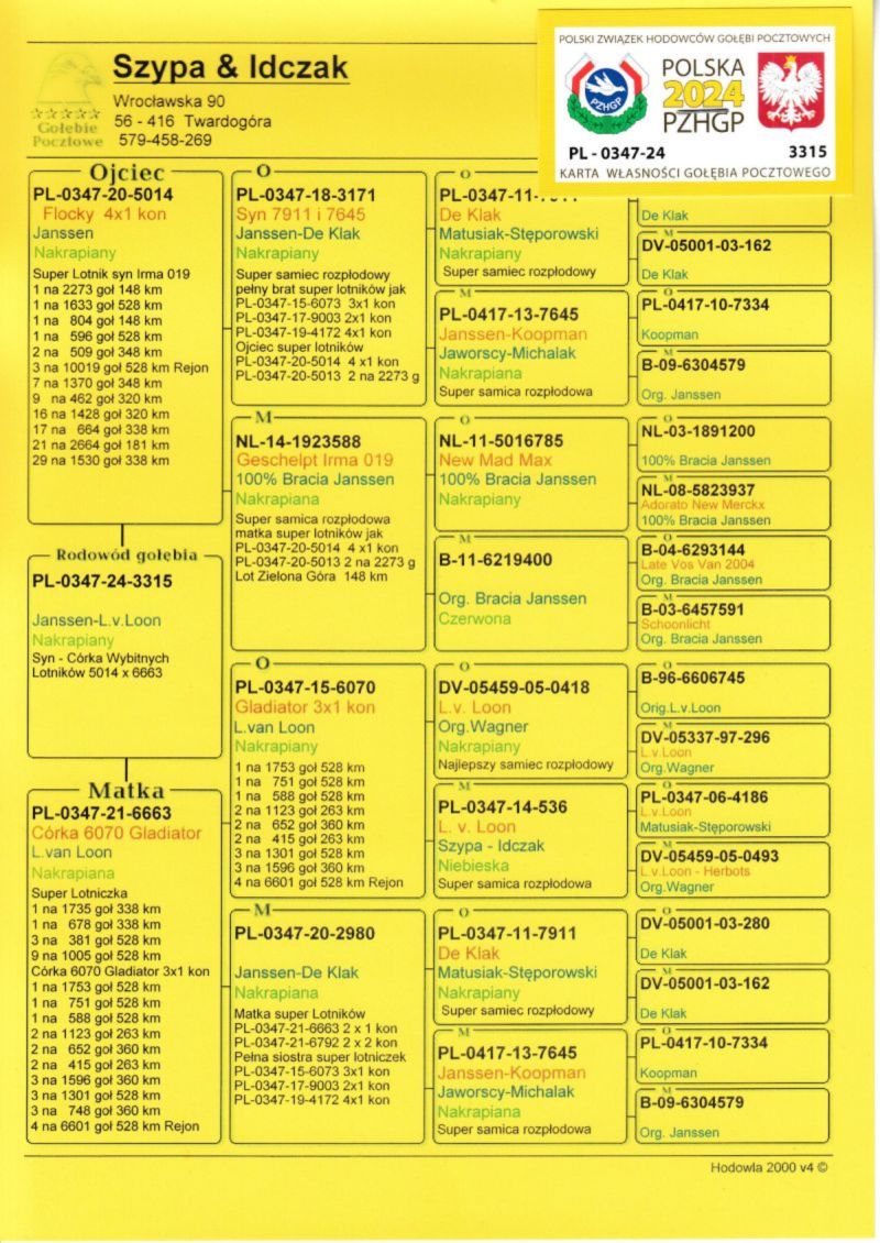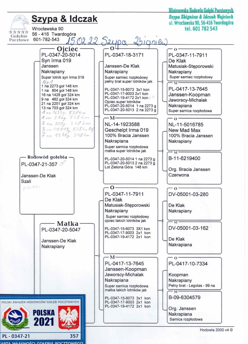 Na potwierdzenie dopisanych ołówkiem konkursów ojca tego gołąbka załączyłem rodowód jego brata, z którego zostały one spisane.