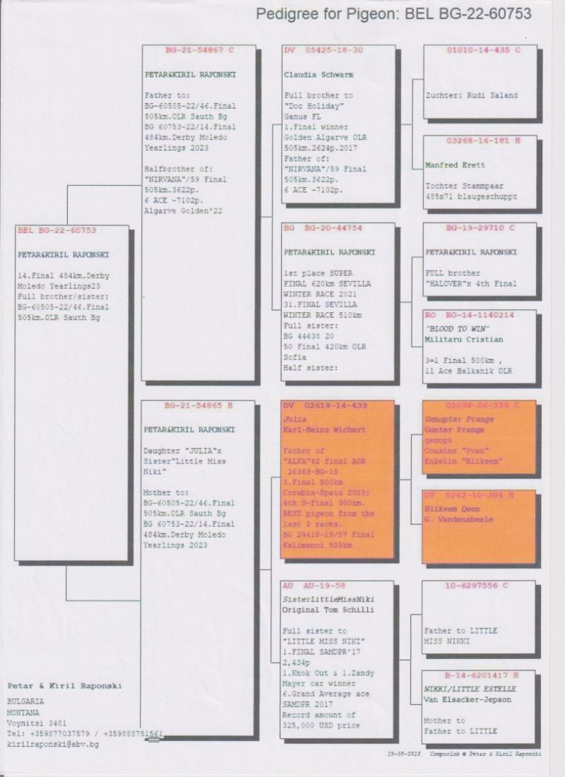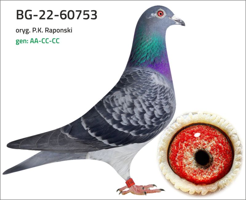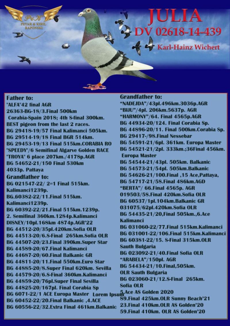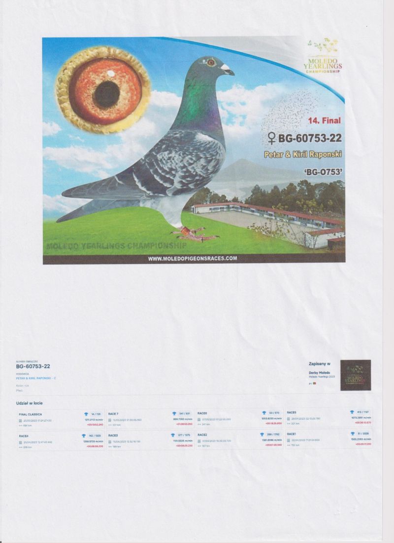 Po gołębiu przedstawionym na aukcji w tym roku było wychowane 4 gołębie młode, po pełnym ciężkim programie lotowym i 5 lotach konkursowych pozostały wszystkie 4 z następującą liczbą konk: 5/5 konk. (14. Lotnik Oddziału), 5/4 konk, 5/3 konk, 5/2 konk. Była w parze z samcem na innej aukcji o nr BG-22-60795.