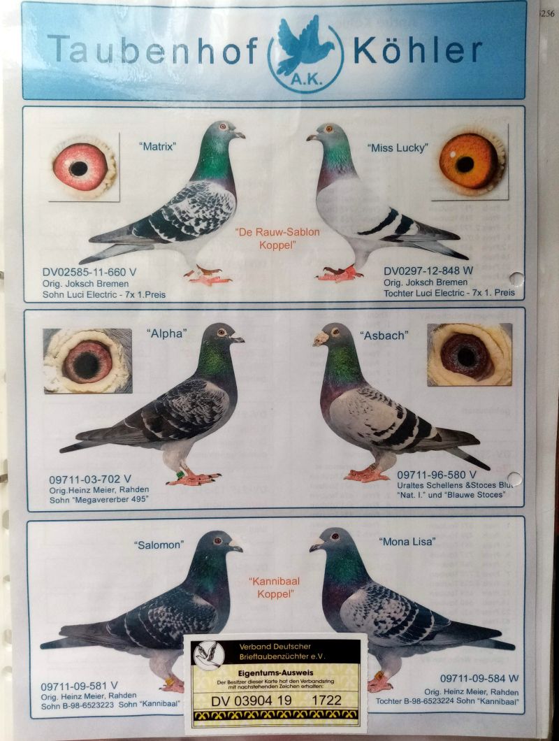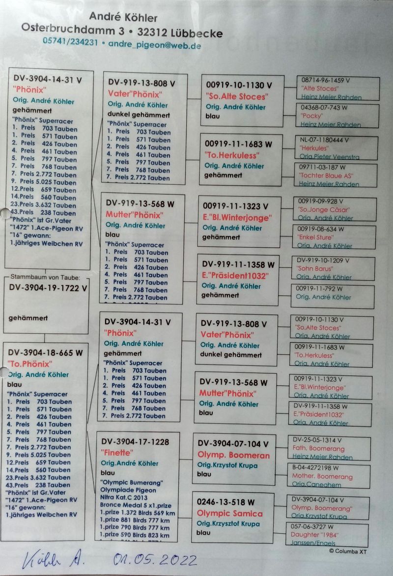 Aukcja grzecznościowa dla hodowcy, który z powodu choroby zmuszony jest sprzedać zakupione do rozpłodu gołębie. Gołąb z hodowli Andre Kohler. Hodowca ten w 2000r. przed Januszem Szalkowskim był opiekunem gołębi u H. Meier – Rahden, w związku z czym w swoim zapleczu posiada wybitne gołębie z tej hodowli. W rodowodach jego gołębi widac, że wywodzą się z najlepszych asów hodowli H. Meier oraz wielu innych wybitnych hodowli, a także gołębi olimpijskich Odbiór do ustalenia, ale najlepiej na Ogólnopolskiej Wystawie w Katowicach. W innym przypadku koszt wysyłki pokrywa kupujący. Więcej informacji w rodowodzie oraz pod nr 691783833