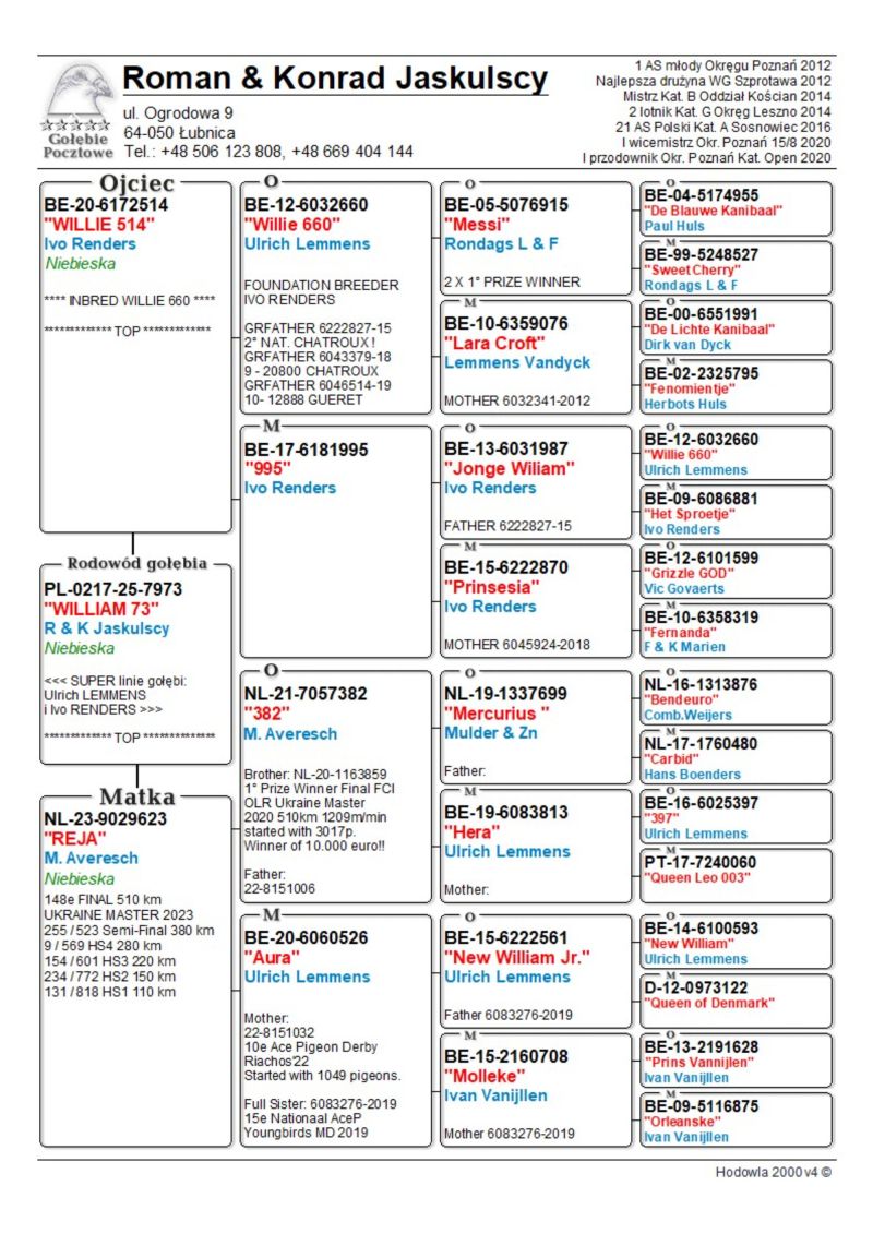 PL-0217-25-7973 inbred "WILLIE 660" *** TOP *** Ivo RENDERS x Ulrich LEMMENS !!! ** odbiór m.in. WYSTAWA OGÓLNOPOLSKA **