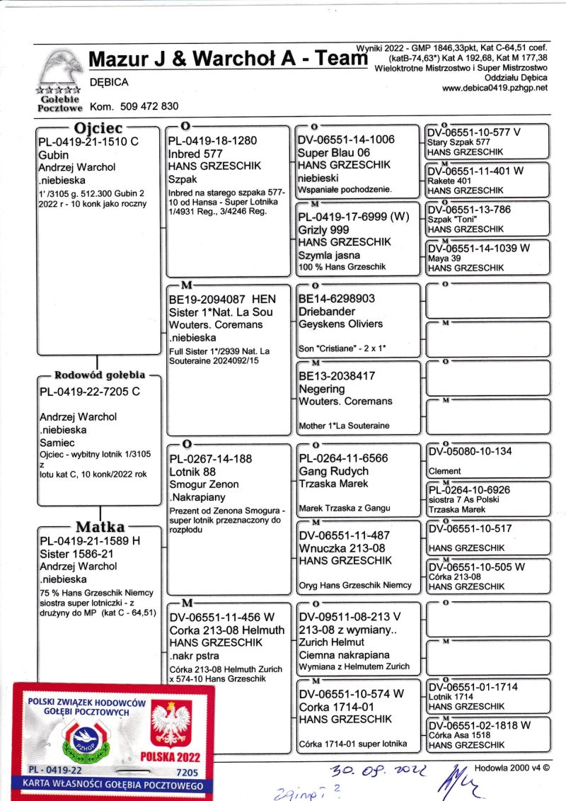 Oryginalny gołąb z hodowli - Mazur J & Warchoł A - Team. Więcej informacji w rodowodzie oraz pod numerem telefonu: 790 818 700