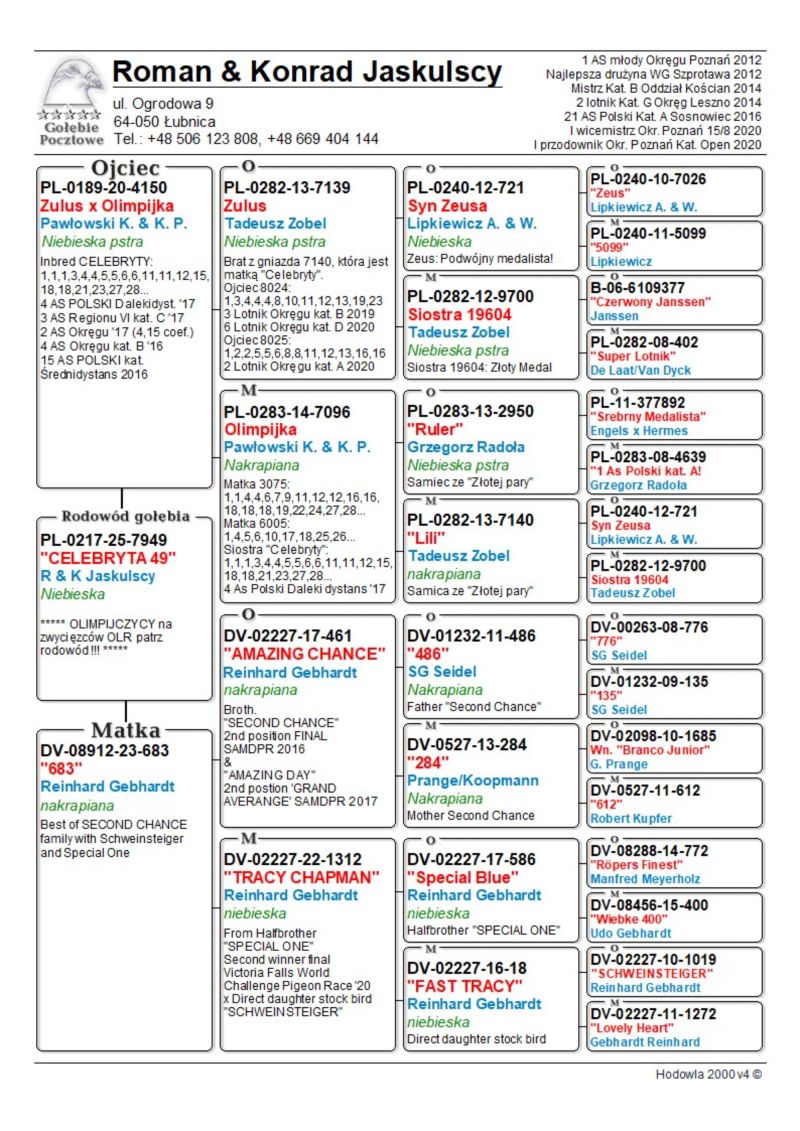 ***** UWAGA !!!!! Możliwy odbiór osobisty lub dostawa realizowana przez kuriera w cenie 160 zł !!!!! Możliwy także odbiór na wystawie Ogólnopolskiej w Katowicach (sobota lub niedziela). UZGODNIENIE TELEFONICZNE !!!!! <<<<< UWAGA, GOŁĄB TO PRAWDOPODOBNIE SAMIEC, NA POCZATKU GRUDNIA 2 LOTKI DO ZRZUCENIA >>>>> Oryginalny gołąb z hodowli Romana & Konrada Jaskulskich. Szczegóły pochodzenia w rodowodzie. Gołąb gotowy do sezonu lęgowego, zaszczepiony Columba PHA i Columba RP oraz przeciwko salmonellozie (Salmo PT). Więcej informacji pod nr tel.: 506 123 808. Wpłata za gołębia na konto po zakończeniu aukcji. Możliwy odbiór osobisty lub dostawa realizowana przez kuriera w cenie 160 zł. Możliwy także odbiór na wystawie Ogólnopolskiej w Katowicach (sobota lub niedziela).