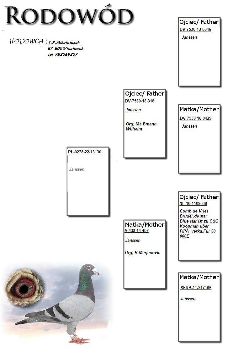 Oryginalny gołąb z hodowli Pawła Mikołajczaka. Szczegóły pochodzenia w rodowodzie. Wysyłka kurierem 160zł Więcej informacji pod nr tel.: 782069207
