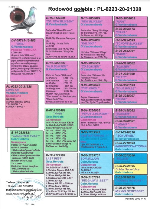 Oryginalny gołąb z hodowli Tadeusza Kapturskiego. Nabyta bezpośrednio od tego hodowcy. Gołąbek to wnuczka słynnego YVAN od rodziny Herbots, jednocześnie inbred na Bliksem od Vandenabeele. Redukcja ptaków rozpłodowych. Kontakt 501 180 849. **Odbiór osobisty na wystawie ogólnopolskiej w Katowicach w sobotę (10.01.2026). Istnieje także możliwość zorganizowania odbioru przez kupującego.