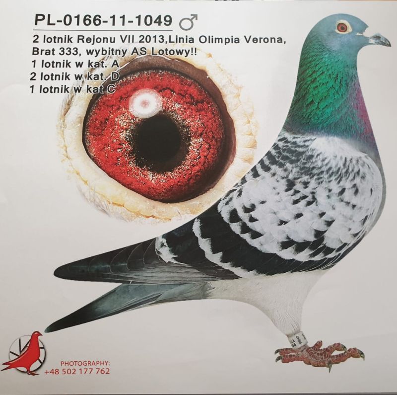 Oryginalny gołąb z hodowli Piotr i Tomasz Knapik. Dziadek ze strony ojca wybitny as rozpłodowy wydał między innymi troje synów, którzy razem zdobyli ponad 200 konkursów. Ze strony matki babcia to super samica rozpłodowa 4499 od Marcina Bochynka, która wydała m.in 1049, 333, 350. Szczegóły pochodzenia w rodowodzie. Więcej informacji pod nr tel.: 609870995 **Wysyłka po uzgodnieniu prywatnym kurierem lub odbiór osobisty