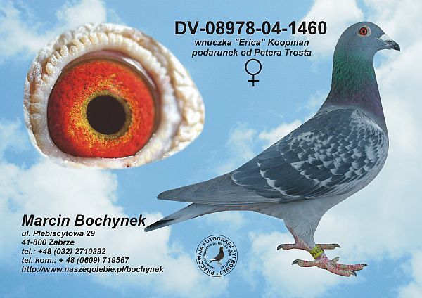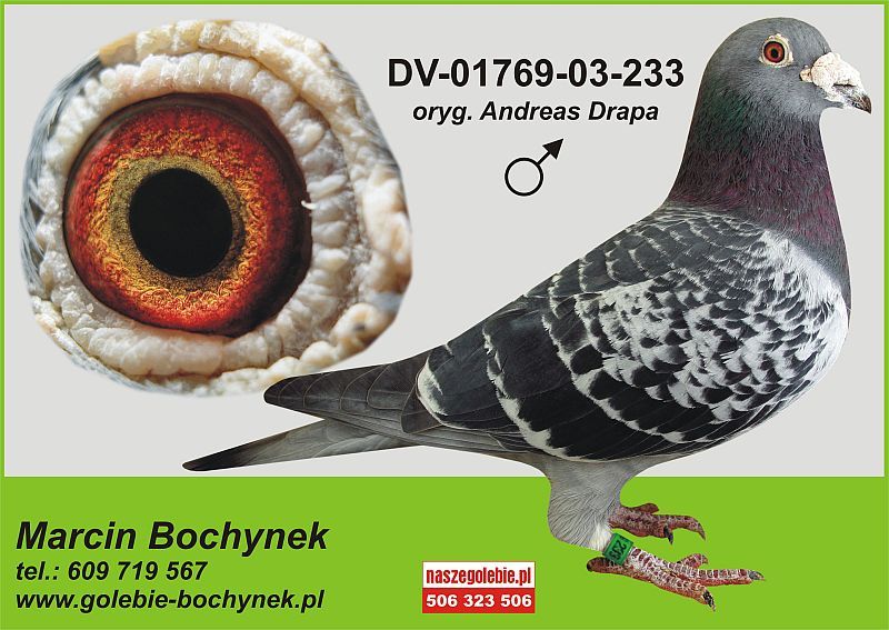 Oryginalny gołąb z hodowli Piotr i Tomasz Knapik. Dziadek ze strony ojca wybitny as rozpłodowy który wydał m.in trzech synów którzy razem zdobyli ponad 200 konkursów. W rodowodzie samiczki znajdują się takie gołębi jak: DV-233, DV-1460, I syn BELGA 5961 od Marcina Bochynka. Szczegóły pochodzenia w rodowodzie. Więcej informacji pod nr tel.: 609870995 **Wysyłka po uzgodnieniu prywatnym kurierem lub odbiór osobisty