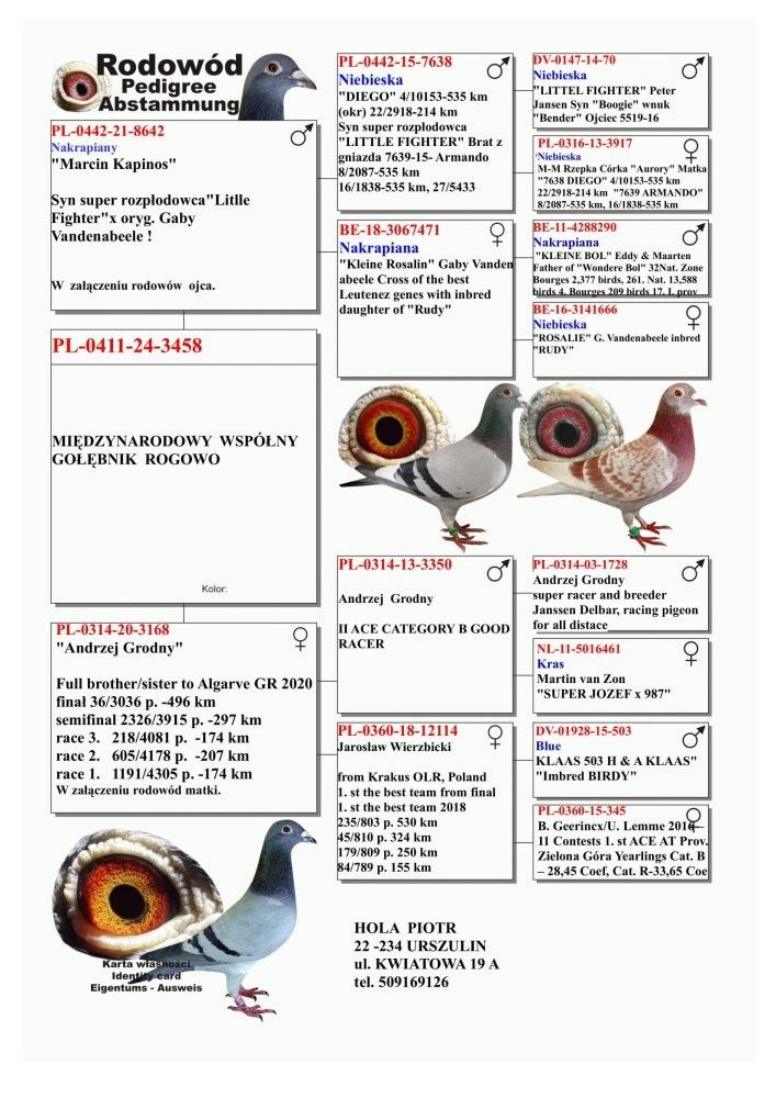 Oryginalny gołąb z hodowli Piotr Hola Szczegóły pochodzenia w rodowodzie. Więcej informacji pod nr tel. 506053616 *możliwy odbiór na Wystawie Ogólnopolskiej w Katowicach