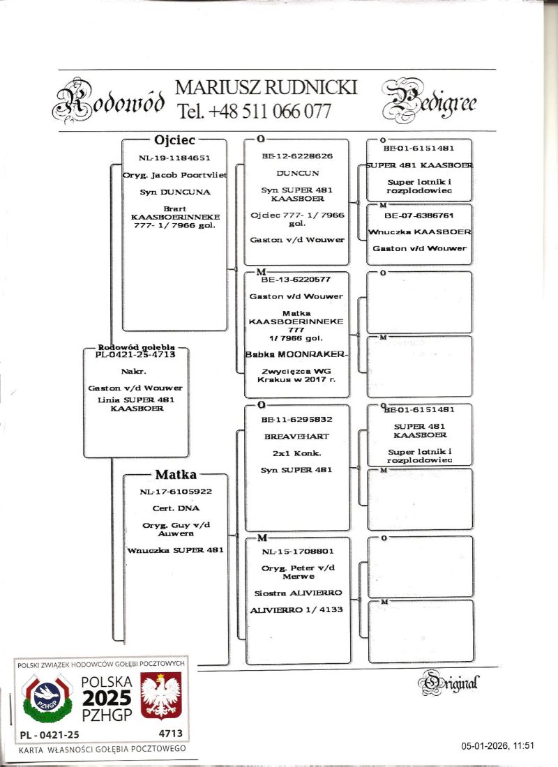 Płeć: młody gołąb Hodowca - rasa: Mariusz Rudnicki Zakończenie: 14.01.2026 godz. 21:42