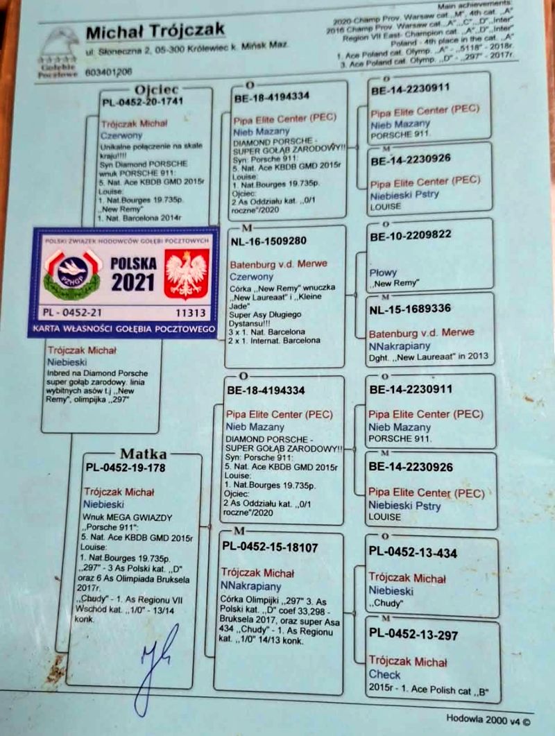 Oryginalny gołab z hodowli Michała Trójczaka. Inbred na Diamond Porsche Super zbudowany gołąb, po kuracjach gotowy do parowania Szczegóły pochodzenia w rodowodzie. Więcej informacji pod nr tel.: 883665660 *koszt transportu pokrywa kupujący UWAGA przed zalicytowaniem proszę o kontakt z właścicielem w sprawie płci oferowanego gołębia