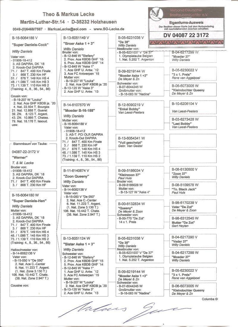 Brat 3 lotnika na WG w Danii. Samiec z oryginalnych gołębi belgijskich od znakomitego hodowcy Willy Danielsa. Co ważne, gołębie pochodzą z hodowli lotujących, a nie komercyjnych. Szczegóły pochodzenia w rodowodzie i pod nr tel. 696 241 555