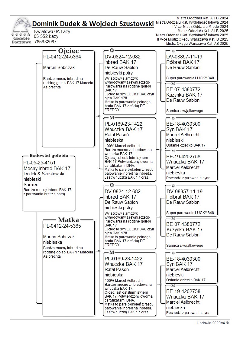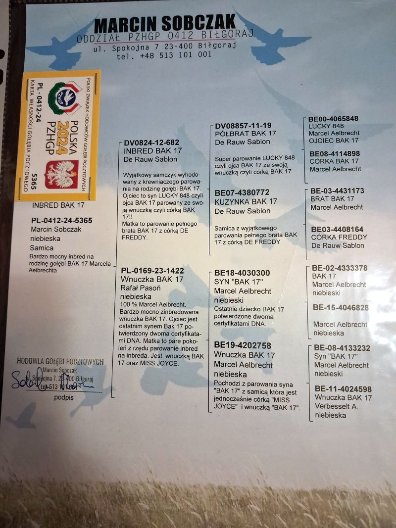 Oryginalny gołąb z hodowli Dudek & Szustowski. Inbred Bak 17, gołąb wyhodowany po gołębiach od Marcina Sobczaka, poniżej zdjęcia i rodowody rodziców Szczegóły pochodzenia w rodowodzie. Więcej informacji pod nr tel.: 785 632 087
