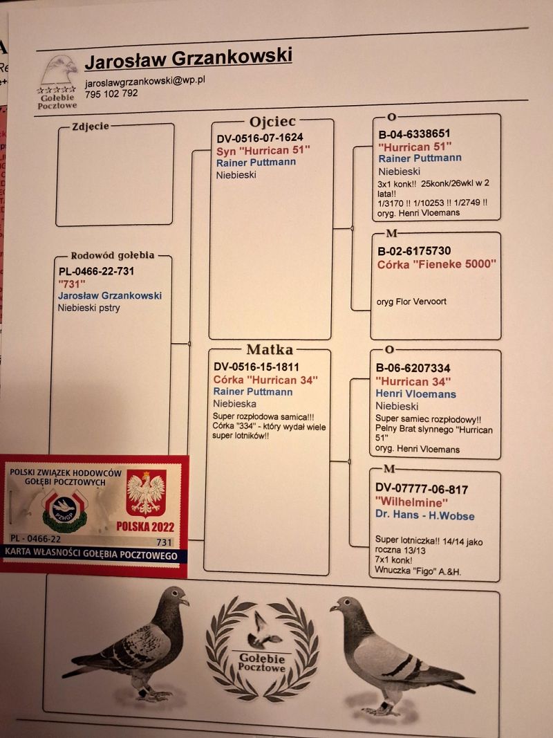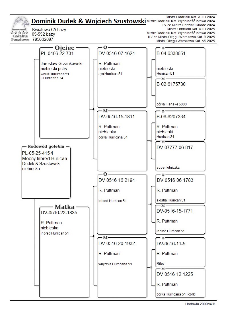 Oryginalny gołąb z hodowli Dudek & Szustowski. Inbred Hurricana 51, gołąb wyhodowany po gołębiach od J. Grzankowskiego i R. Puttmanna, poniżej zdjęcia i rodowody rodziców Szczegóły pochodzenia w rodowodzie. Więcej informacji pod nr tel.: 785-632-087