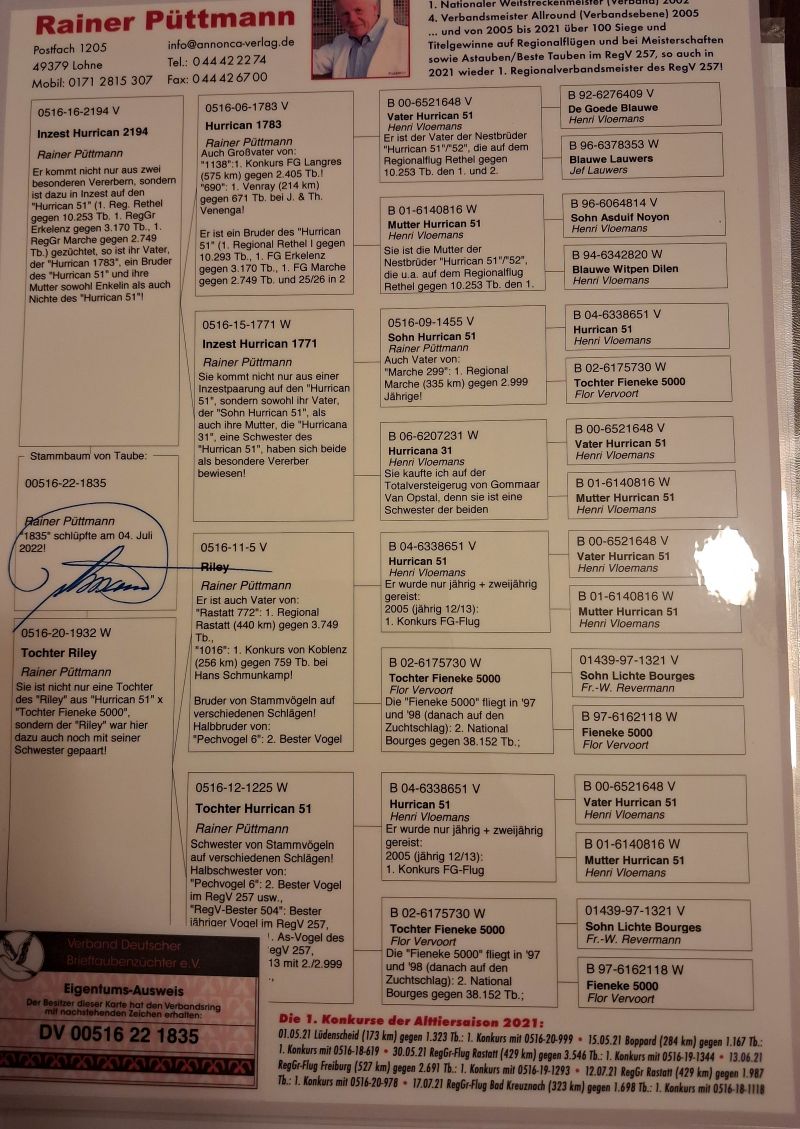 Oryginalny gołąb z hodowli Dudek & Szustowski. Inbred Hurricana 51, gołąb wyhodowany po gołębiach od J. Grzankowskiego i R. Puttmanna, poniżej zdjęcia i rodowody rodziców Szczegóły pochodzenia w rodowodzie. Więcej informacji pod nr tel.: 785-632-087