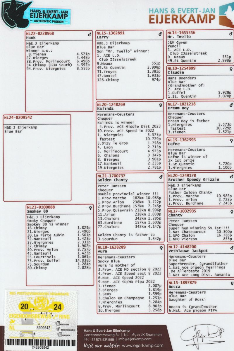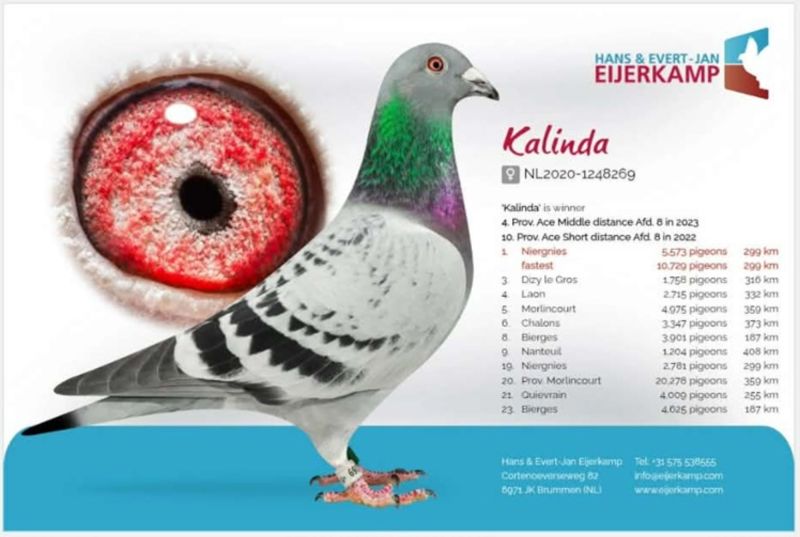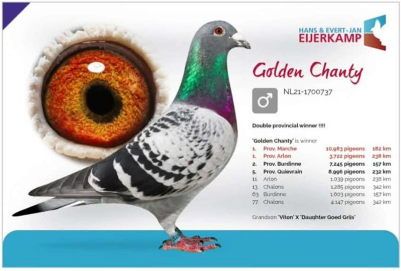 Oryginalny gołąb z hodowli Hans & Evert-Jan Eijerkamp. Wnuczka Golden Chanty oraz Kalindy. Szczegóły pochodzenia w rodowodzie. Więcej informacji pod numerem telefonu 698-336-014.