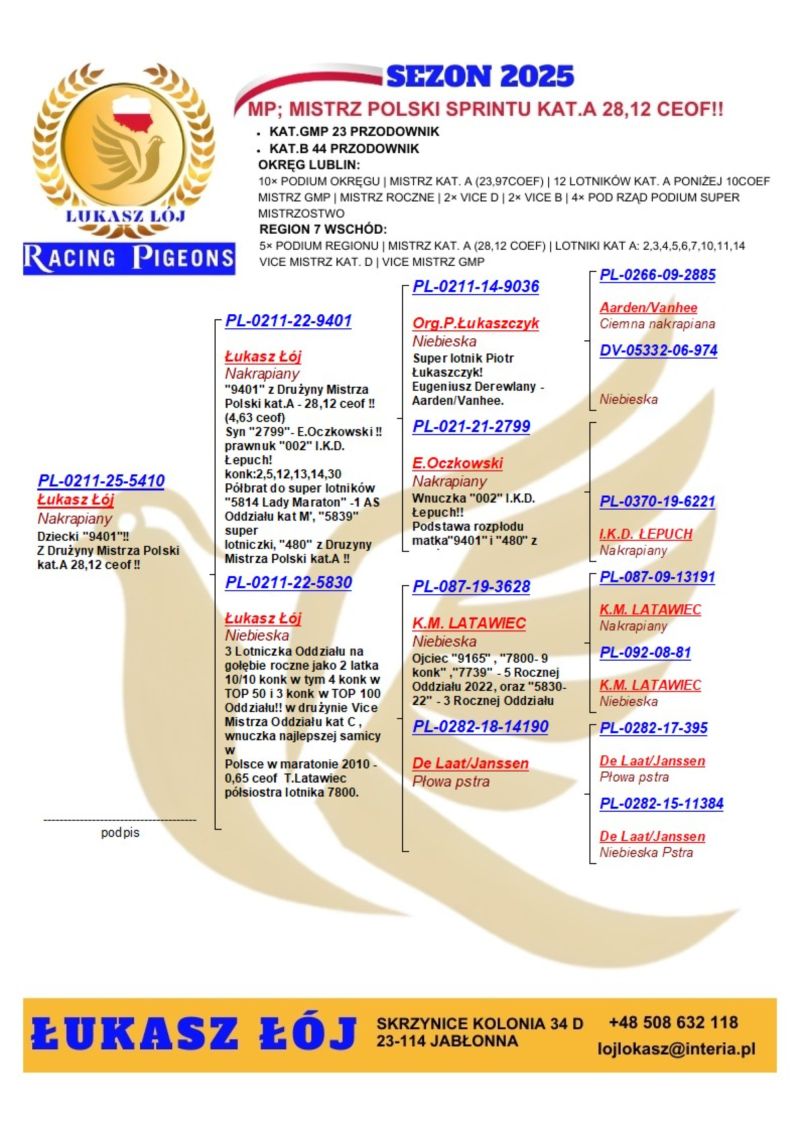 DZIECKO WSPANIAŁEGO LOTNIKA "9401" - 3 WYNIK W DRUŻYNIE MISTRZA POLSKI 2025 - KAT. A 4,63 COEFF. / W SEZONIE 2025 ZDOBYŁ M.IN.: 2, 5, 12, 13, 14, 30.. / 10 AS OKRĘGU LUBLIN KAT. B - 12,40 COEFF. | DZIECKO SUPER LOTNICZKI "5830" -> 3 ROCZNA LOTNICZKA ODDZIAŁU 2023 / W SEZONIE 2024 ZOBYŁA 7X KONKURS W TOP 100 ODDZIAŁU (4X W TOP 50) I ŁĄCZNIE 10/10 KONK. | WNUK FENOMENALNEJ SAMICY ROZPŁODOWEJ "2799" ORyG. E. OCZKOWSKI (WNUCZKA "002" !!) - DWÓJKA JEJ DZIECI W DRUŻYNIE MISTRZA POLSKI !!