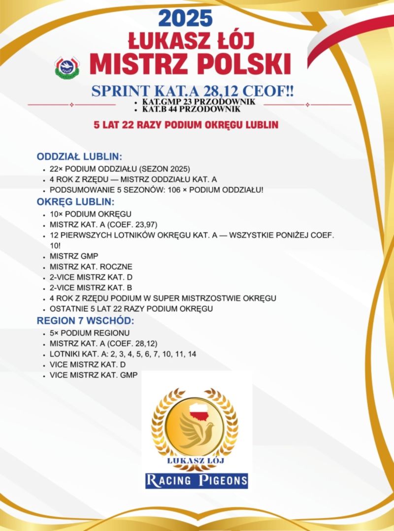DZIECKO SUPER ROCZNEGO LOTNIKA "641" -> 4 AS OKRĘGU LUBLIN 2025 - KAT. A 4,68 COEFF. / W DRUŻYNIE MISTRZA OKRĘGU LUBLIN KAT. A (Z CAŁOŚCI - WYNIK DRUŻYNY 23,97 COEFF.) / W SEZONIE 2025 SAMCZYK ZDOBYŁ M.IN.: 2, 6, 6.. !! | DZIECKO SUPER LOTNICZKI "7792" - M.IN.: 3 KONKURS NA ODDZIAŁ Z LOTU SYKE 961 KM / W DRUŻYNIE II V-CE MISTRZA REGIONU ORAZ 36 PRZODOWNIKA POLSKI W KAT. MARATON 2024R !! | WNUCZKA BAZOWEGO ROZPŁODOWCA "3599" I. K. D. ŁEPUCH (WNUK 5 ASA POLSKI KAT. SPORT D)