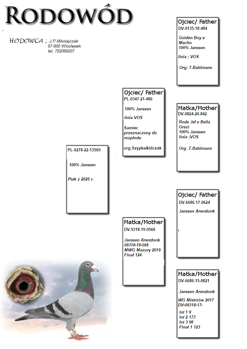 Oryginalny gołąb z hodowli Pawła Mikołajczaka. Szczegóły pochodzenia w rodowodzie. Więcej informacji pod nr tel.: 782069207 *wysyłka prywatnym kurierem