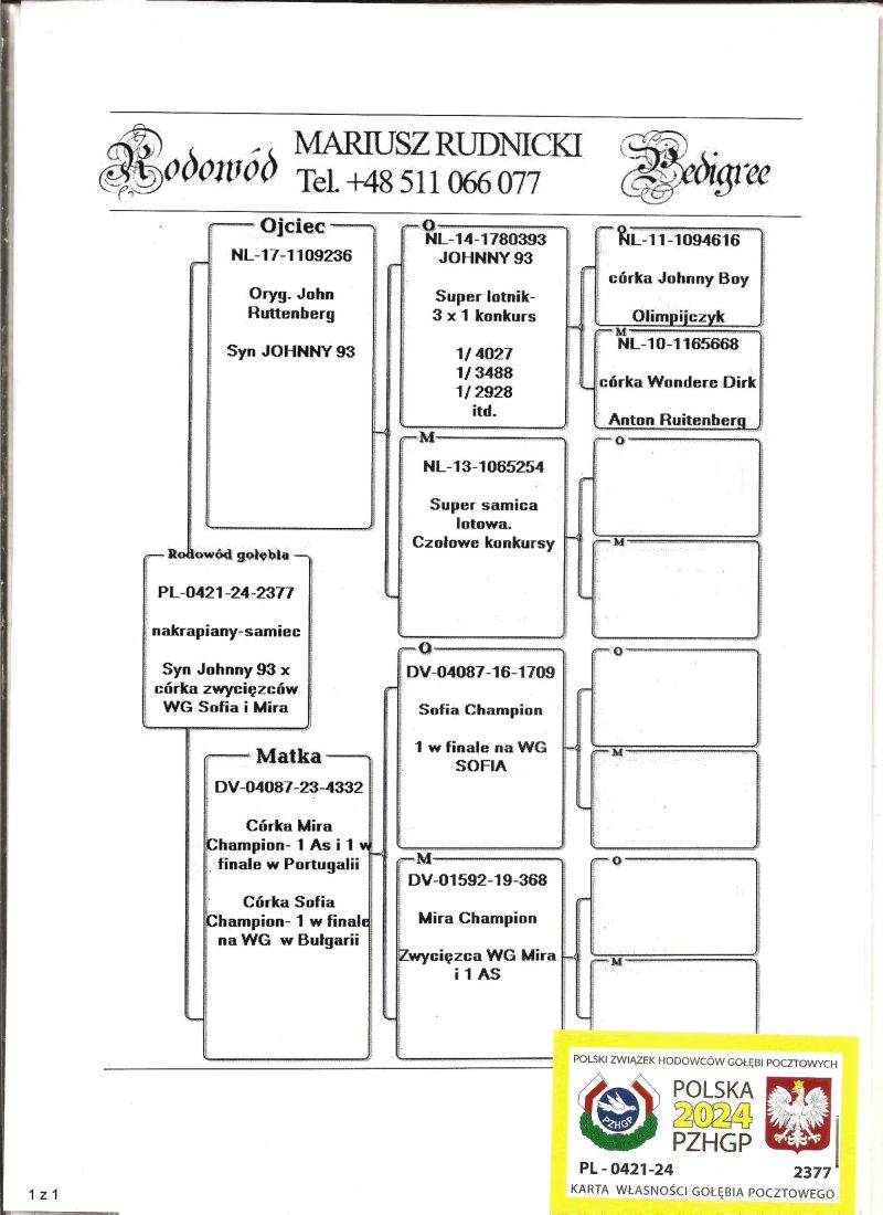 PL-0421-24-2377 Córka zwycięzców WG SOFIA i MIRA x syn JOHNNY 93- czołowy lotnik Holandii 3x1 konkurs