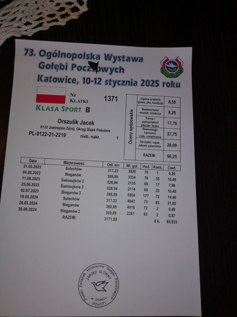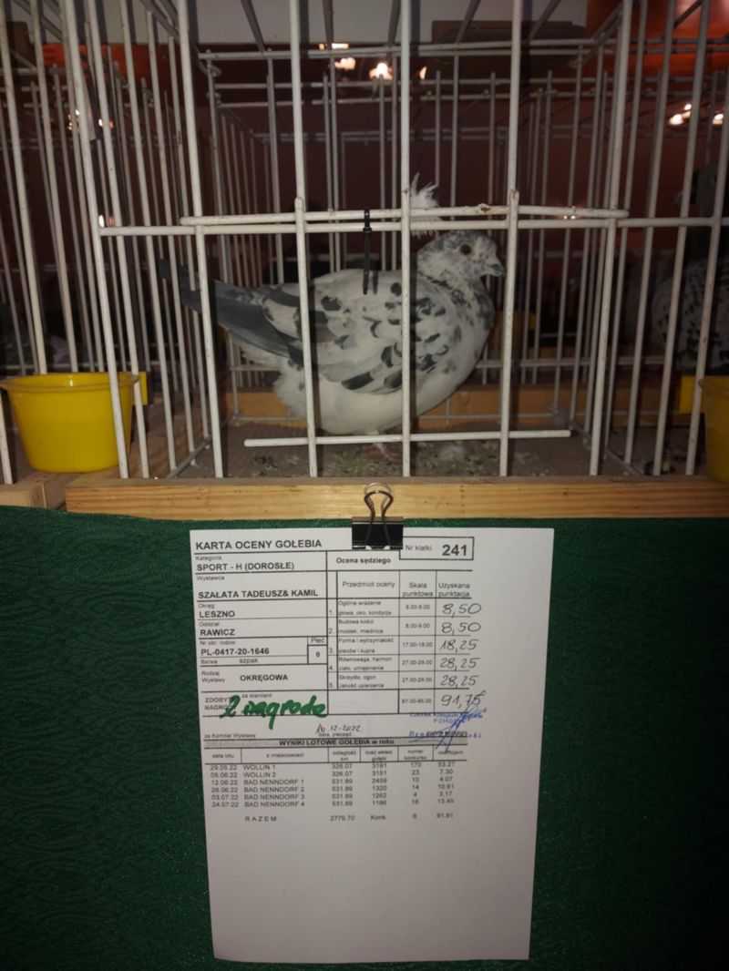 Bardzo fajny samczyk - totalny inbred na mojego najlepszego samca rozpłodowego na gołębniku - "461" "17913" (syn 1215)- najlepszy mój samiec rozpłodowy jeżeli chodzi o WG i nie tylko samiczka 6334-14 najlepiej punktowała mi do GMP 2017 kiedy udało się zdobyć XII miejsce w Polsce. Samiczka jest też właśnie wnuczką 1215 , z którego wywodzą się z ....8,25(dla Kol.Chłopeckiego) , 35 , 130 ,231 , 263 , 277 , 278 gołąb w finale SAMDPR w RPA wywodził się z 1215 ...szczególnie ta czołówka wydaje mi się , że jest imponująca ...nie wiele jest takich linii , które potrafią takie coś zrobić... po bracie 17913 - 15978 był też w 2020 roku 5 gołąb w finale WG Krakus . "2644" (podwójna wnuczka "17913") - babka 2 super samic Lotowych u Kol Kazimierza Goździejewskiego ( jedna w kat M w 2023 roku miała coeff 4,84 a druga w 2024 roku 2,58 - 2 x 1 na oddział - w kat "I" - coeff 9 z haczykiem) "The Thrill is Gone"(Hooymans x Tournelle) - 6 As Hot Spotów na ostatniej edycji SAMDPR - była to najwyższa lokata polskiego gołębia w historii imprezy 42 ,144 ,243 , 248 pozycje w Hot Spotach na kilka grubych tysięcy gołębi , Siostra 821-22 była 17 w Extra Finale WG Krakus 2022 , kolejna siostra 3 poz w 1/2 finale Derby Arona 2020/2021 , kolejne rodzeństwo Ojciec 10163-21 - 304 poz w finale Pattaya OLR wygrała 1200 $ oraz współzdobywczyni 5 "Małej Drużyny" , która wygrała 2000 $ ! "791" - ojciec "ZigZag McQueen" - 117 poz w finale SAMDPR , ojciec "Lotniskowej" , najlepszej samicy rozpłodowej u Kol Krzyśka Kusia oraz dziadek 8755 - rezerwa na olimpiadę w kat olimpijskiej maraton . Jest też pradziadkiem PL-0122-22-2219 - w 2 sezony na 21 wkładań 20 konkursów - kat A coeff 9,08 a z dwóch lat do wystaw kat A-74,86 , kat B-65,94 a kat D-72,20 W 2023 roku zdobył 1 konk na ok 4100 gołębi z miejsc Sulechów a w 2024 roku 2 x 2 konk w oddz !!! oraz PL-0122-22-5510 w kat A w 2024 roku uzyskał coeff. 4,75 Zdobył też 1 konk na oddz z miejsc. Brzeg Dolny na 4322 gołębie !! Został też 4 Asem Polski kat krótki dystans 2024 z coeff 17 z groszem z 5 lotów do kat A właśnie dla Kolegi Jacka Orszulika !!!oraz ojciec , dziadek i pradziadek wielu wybitnych gołębi rozpłodowych i lotowych na wielu gołębnikach !! "Felle 040" dziadek m.in 8755 , który dla Kol . Krzyśka Kusia wylatał 4 wynik w Polsce w kat olimpijskie E i był gołębiem rezerwowym na olimpiadę. Jest też pradziadkiem PL-0122-22-2219 - w 2 sezony na 21 wkładań 20 konkursów - kat A coeff 9,08 a z dwóch lat do wystaw kat A-74,86 , kat B-65,94 a kat D-72,20 W 2023 roku zdobył 1 konk na ok 4100 gołębi z miejsc Sulechów a w 2024 roku 2 x 2 konk w oddz !!! oraz PL-0122-22-5510 w kat A w 2024 roku uzyskał coeff. 4,75 Zdobył też 1 konk na oddz z miejsc. Brzeg Dolny na 4322 gołębie !! Został też 4 Asem Polski kat krótki dystans 2024 z coeff 17 z groszem z 5 lotów do kat A właśnie oraz także pradziadkiem PL-0122-21-2246 - na 16 wkładań 16 konkursów i w 2024 roku uzyskał kat A - 10,32 coeff , kat B - 8,64 coeff a z dwóch lat do wystaw kat A 53 coeff i został na ostatniej wystawie TYTUŁ 17 ASA POLSKI , w kat olimp B - 67,76 coeff a w kat D - 53,20 coeff a w 2024 roku w kat średni dystans został w/g konkursu redakcji ZOSTAŁ 9 ASEM A TAKŻE WYGRAŁ Z LOTU OKRĘGOWEGO NA 8137 GOŁĘBI Z LOTU ŚWINOUJŚCIE + 500 KM i pradziadkiem PL-0122-22-5118 uzyskał w tym 2024 roku coeff 5,24 w kat A oraz w 2023 roku 2 konk na oddział z lotu Bieganów na ok 3000 gołębi oraz 2 konkurs na oddział w 2024 rokuz miejscowości Kościan na około 4300 gołębi dla Kolegi Jacka Orszulika !!!"Felle" jest też ojcem dziadkiem wielu innych super gołębi lotowych - asów na szczeblu sekcji , oddziału i okręgu oraz gołębi ropzłodowych ! "461" najważniejsze referencje z 2024 roku: 1 As Rejonu z 8 lotów rejonowych - prawnuczka 461 u Kol Adama Gasperowicza, prawnuk "461" wygrał finał na WG Podhale wygrywając 50 000 dla Kolegi Bogdana Bieli !- liczba jedynek jego wnuków , prawnuków i oczywiście dzieci będzie około stu a kilkadziesiąt gołębi z 461 zajmowało top 10 w kat As w różnych kategoriach w różnych okręgach w Polsce- tylko w 2022 roku w 9 różnych oddziałach przeważnie prawnuki zdobywały 1 lokatę w oddz !!! Jego wnuczka została też na olimpiadzie w tym roku 4 gołębiem świata w kat H dla Kol Łukasza Reguły. !! Na screenie przykład jak potrafią siadać gołębie w oddz z linii 461 ... 3-prawnuk,4 -wnuk , 5-wnuk , 6 - roczna wnuczka - kat A 9 z groszem ma , 7 wnuk , 11 - wnuk oraz 15 - wnuk 461. oraz kolejny lot z 2020 roku : 1,2,3,5,7,8 wnuk oraz 15 prawnuk ? do tego roczna samiczka Kolegów Piotra I Marcina Żureckich z Kępna została 6 asem Polski w kat G ...tak leciała... 2 na 5200 g ze 174 km 8 na 4573 z 219 km 8 na 3583 g z 324 km 8 na 1764 g z 324 g 21 na 4535 g z 549 km - rej - coeff jak widać na zdjęciu 13,54 miała też szósty super lot była 25 na 4984 g coeff 5,02 1 goląb z Extra finału na WG Giewont 2022 dla Teamu Chudy-Molek to też linia "461" ojciec to syn mojej super wdowy 2161-12 ,, Dwie Prawnuczki .... u Kol Kazimierza Goździejewskiego ( jedna w kat M w 2023 roku miała coeff 4,84 ( 1 as okręgu Wałbrzych a druga w 2024 roku 2,58 - 2 x 1 na oddział (2 as Polski kat M w/g miesięcznika "Hodowca") - w kat "I" - coeff 9 z haczykiem), "461" to też pradziadek PL-0122-22-2219 - w 2 sezony na 21 wkładań 20 konkursów - kat A coeff 9,08 a z dwóch lat do wystaw kat A-74,86 , kat B-65,94 a kat D-72,20 W 2023 roku zdobył 1 konk na ok 4100 gołębi z miejsc Sulechów a w 2024 roku 2 x 2 konk w oddz !!! oraz pradziadek PL-0122-22-5510 w kat A w 2024 roku uzyskał coeff. 4,75 Zdobył też 1 konk na oddz z miejsc. Brzeg Dolny na 4322 gołębie !! Został też 4 Asem Polski kat krótki dystans 2024 z coeff 17 z groszem z 5 lotów do kat A właśnie dla Kolegi Jacka Orszulika !!! oraz wiele,wiele innych.....od 2017 roku 30x mistrzostwo oddz w ró