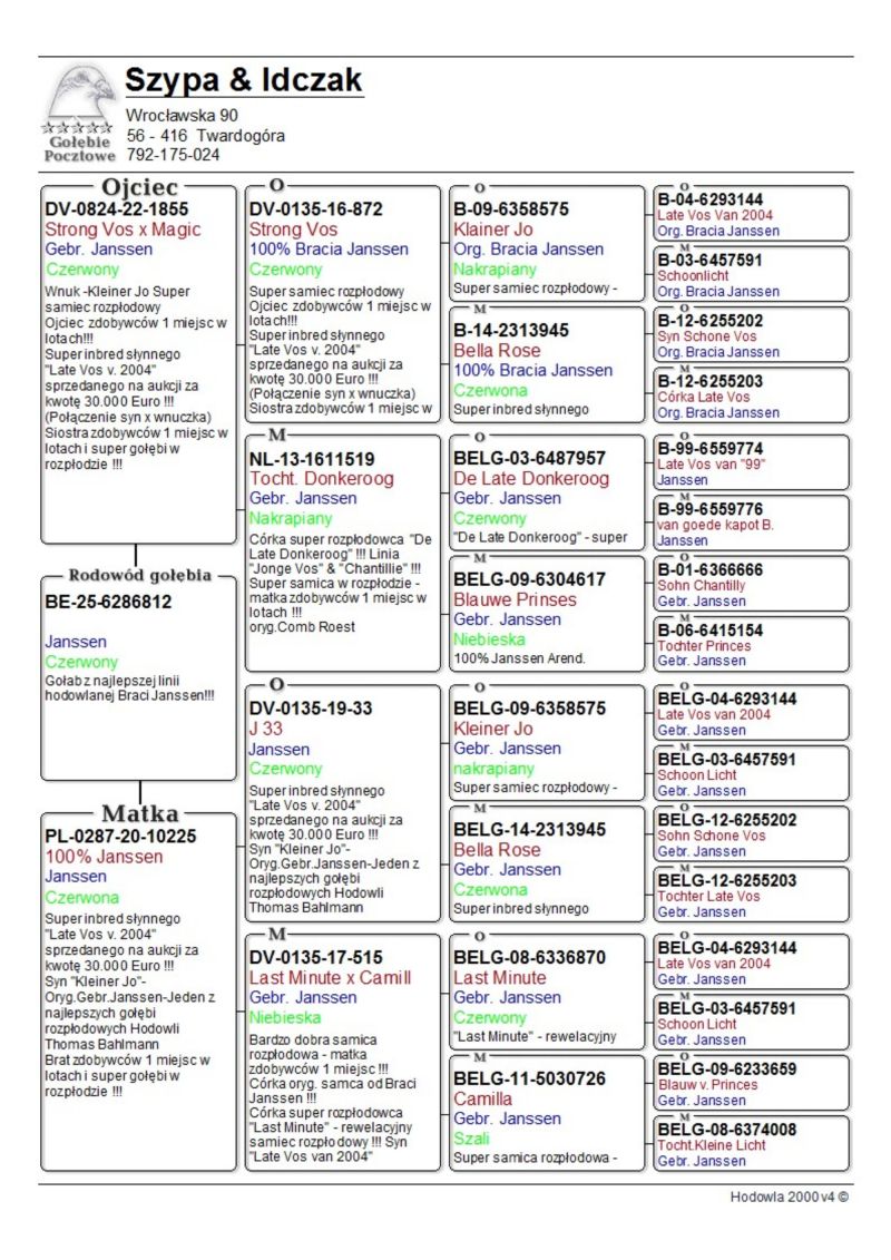 Profesjonalna hodowla z wieloletnim doświadczeniem, posiadająca w swoim stadzie materiał najwyższej światowej klasy. Więcej informacji w załączonych materiałach oraz pod nr tel. 792-175-024 Oferowany gołąb to prawdopodobnie SAMIEC MOŻE BYĆ WIĘKSZA SAMICA. Płeć pisana orientacyjnie Wysyłka 100 zł