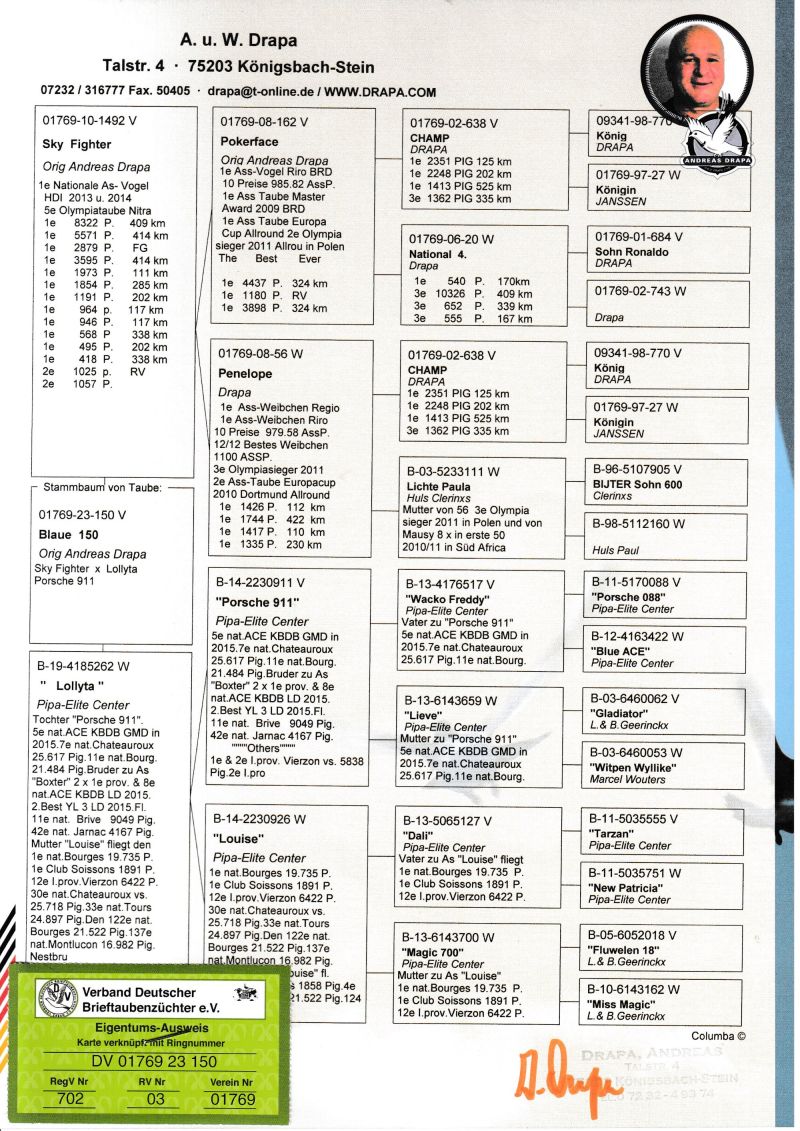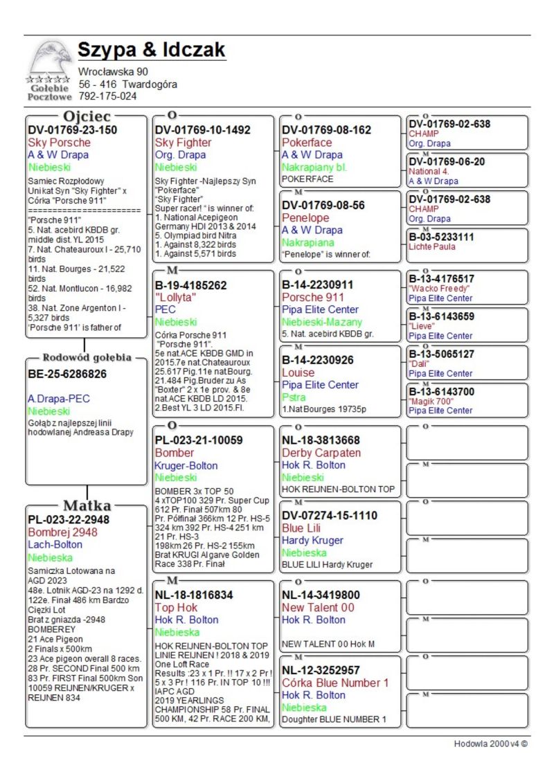 Profesjonalna hodowla z wieloletnim doświadczeniem, posiadająca w swoim stadzie materiał najwyższej światowej klasy. Więcej informacji w załączonych materiałach oraz pod nr tel. 792-175-024 Oferowany gołąb to prawdopodobnie SAMICA. Płeć pisana orientacyjnie Wysyłka 100 zł