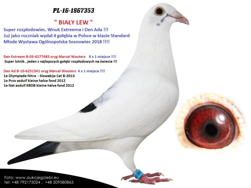 Cena obowiązuje tylko na tej aukcji wszystkie wystawiane przez nas gołebie pochodzą z rozpłodu albo z golębi rozpłodowych. Nie sprzedajemy indywidualnie gołębi w Domu. Jedyna szansa kupna to właśnie AUKCJA. Przy 5 kupionych gołebiach transport GRATIS na terenie Polski.( Wpłata na konto po zakonczonej aukcji za golębia )GOŁĄB GOTOWY DO ŁĄCZENIA W PARĘ