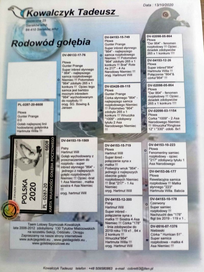 Oryginalny gołąb z hodowli Tadeusza Kowalczyka. Szczegóły pochodzenia w rodowodzie. Więcej informacji pod nr tel.: 730602025 Odbiór osobisty lub po uzgodnieniu transportu. Gołębie młode 2021rok 2 przodownik 7z 50, 1 przodownik 10z całości, 24 przodownik okręgu Kraków, 2022rok 2 przodownik 7z 50, Vice Mistrz 10 z całości, 2023 rok 2 przodownik 10 z całości, 2 przodownik 10 z 50