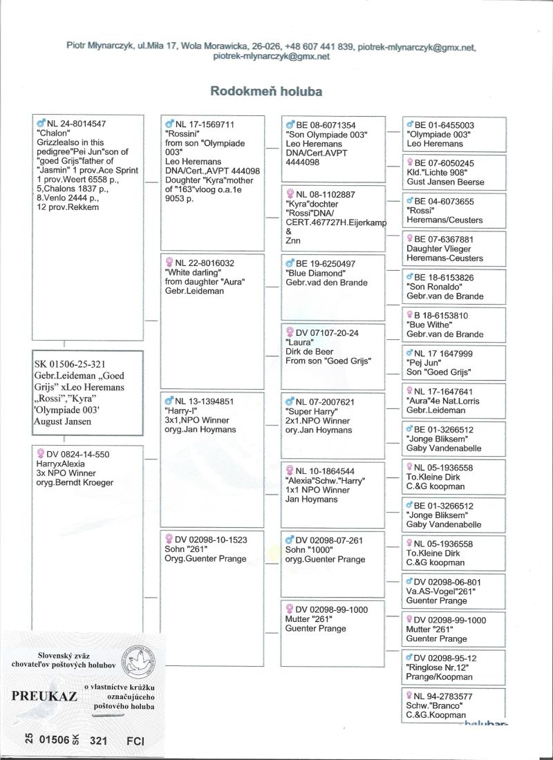 Ojciec gołębia to "Chalon" prawnuk "Olimpiade 003"Leo Hereman i Prawnuk"Pej Jun" son "Goed Grijs"gebr.Leideman,matka gołębia to wnuczka "Super Harry" Jan Hoymans i wnuczka "261"Guenter Prange.Gołąb zaszczepiony MSV i odrobaczony.Transport kurierem po wcześniejszym uzgodnieniu,odbiór osobisty.