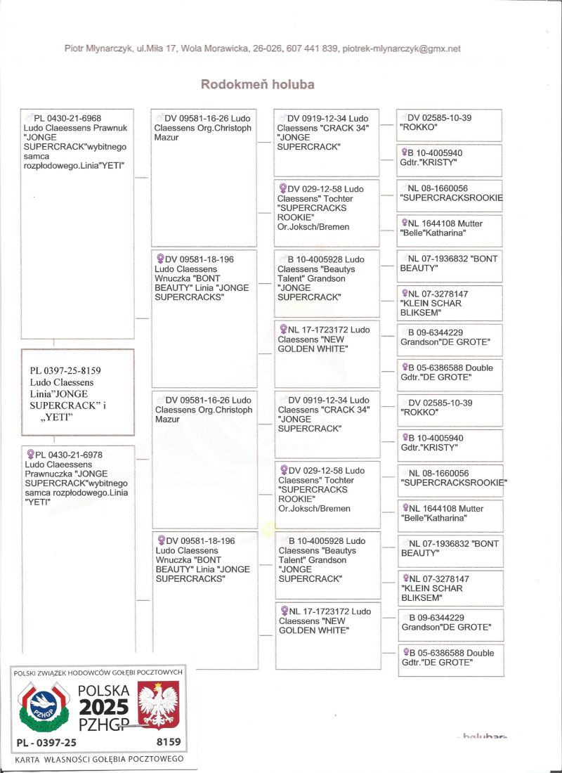 : Ludo Claessens po oryginałach od Christoph Mazur. Linia 'Yeti" i "Jonge Supercrack". Gołąb zaszczepiony MSV i odrobaczony. Transport kurierem po wcześniejszym uzgodnieniu,odbiór osobisty.Proszę o kontakt w sprawie płci gołębia.