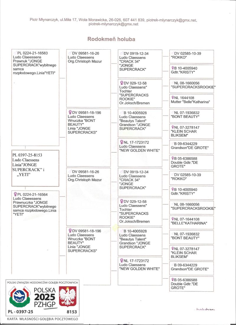 Ludo Claessens po oryginałach od Christoph Mazur. Linia 'Yeti" i "Jonge Supercrack". Gołąb zaszczepiony MSV i odrobaczony. Transport kurierem po wcześniejszym uzgodnieniu,odbiór osobisty.Proszę o kontakt w sprawie płci gołębia.