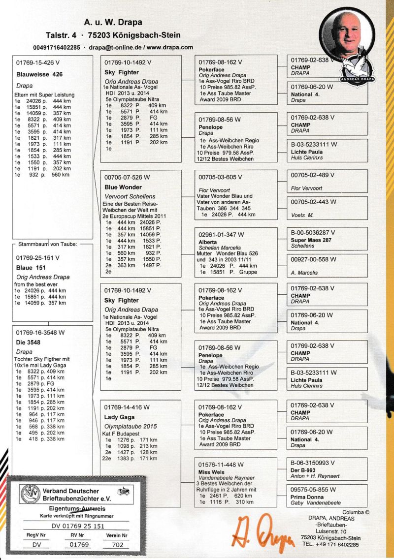 UWAGA PODBICIE NA TEJ AUKCJI WYNOSI 50 ZŁ Oryginalny gołąb z hodowli Andreasa Drapy. Szczegóły pochodzenia w rodowodzie. Oferowany gołąb to prawodopodobnie SAMIEC. Gołąb jest własnością Andreasa Drapy i znajduje się już w Polsce u kolegi Roberta Grochowskiego. Gołębia można obejrzeć w Urbanowicach woj. opolskie, po wcześniejszym kontakcie telefonicznym. Sprzedający może zorganizować transport gołębia. Koszt przesyłki do najbliższego większego miasta obok miejscowości kupującego to około 70-100zł. Więcej informacji pod numerem 600133330. Gołębie są zaszczepione w grudniu SALMOVIREM. SĄ TO OSTATNIE GOŁĘBIE Z ROCZNIKA 2025