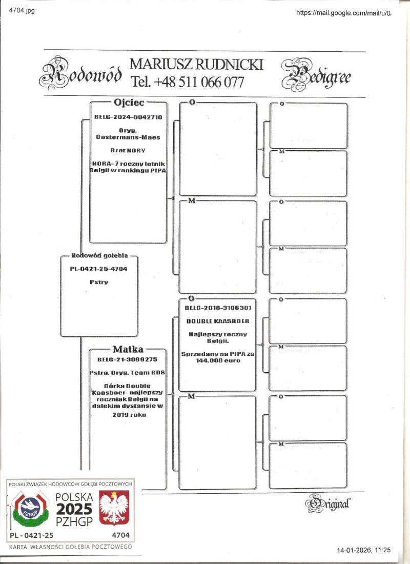 Płeć: samiec Hodowca - rasa: Mariusz Rudnicki Zakończenie: 22.01.2026 godz. 20:12