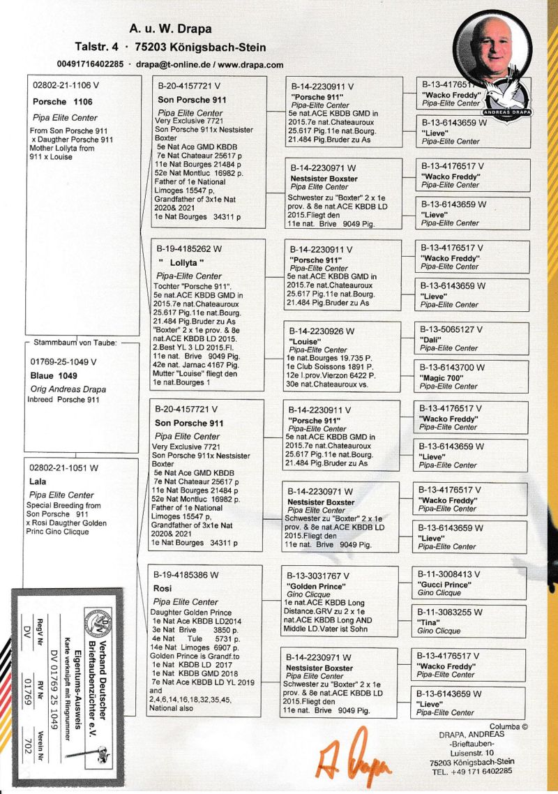 UWAGA PODBICIE NA TEJ AUKCJI WYNOSI 50 ZŁ Oryginalny gołąb z hodowli Andreasa Drapy. Szczegóły pochodzenia w rodowodzie. Oferowany gołąb to prawodopodobnie SAMIEC. Gołąb jest własnością Andreasa Drapy i znajduje się już w Polsce u kolegi Roberta Grochowskiego. Gołębia można obejrzeć w Urbanowicach woj. opolskie, po wcześniejszym kontakcie telefonicznym. Sprzedający może zorganizować transport gołębia. Koszt przesyłki do najbliższego większego miasta obok miejscowości kupującego to około 70-100zł. Więcej informacji pod numerem 600133330. Gołębie są zaszczepione w grudniu SALMOVIREM. SĄ TO OSTATNIE GOŁĘBIE Z ROCZNIKA 2025