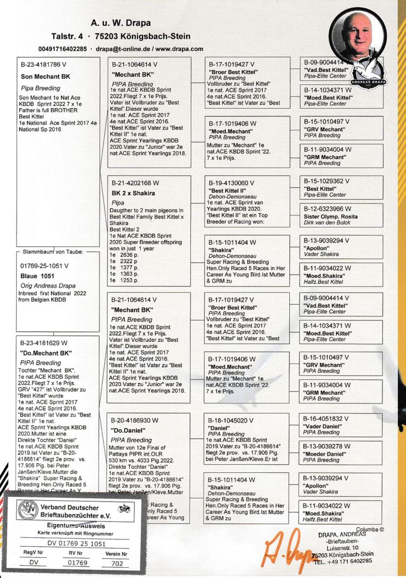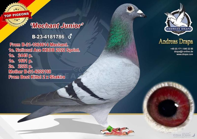 UWAGA PODBICIE NA TEJ AUKCJI WYNOSI 50 ZŁ Oryginalny gołąb z hodowli Andreasa Drapy. Szczegóły pochodzenia w rodowodzie. Oferowany gołąb to prawodopodobnie SAMIEC. Gołąb jest własnością Andreasa Drapy i znajduje się już w Polsce u kolegi Roberta Grochowskiego. Gołębia można obejrzeć w Urbanowicach woj. opolskie, po wcześniejszym kontakcie telefonicznym. Sprzedający może zorganizować transport gołębia. Koszt przesyłki do najbliższego większego miasta obok miejscowości kupującego to około 70-100zł. Więcej informacji pod numerem 600133330. Gołębie są zaszczepione w grudniu SALMOVIREM. SĄ TO OSTATNIE GOŁĘBIE Z ROCZNIKA 2025
