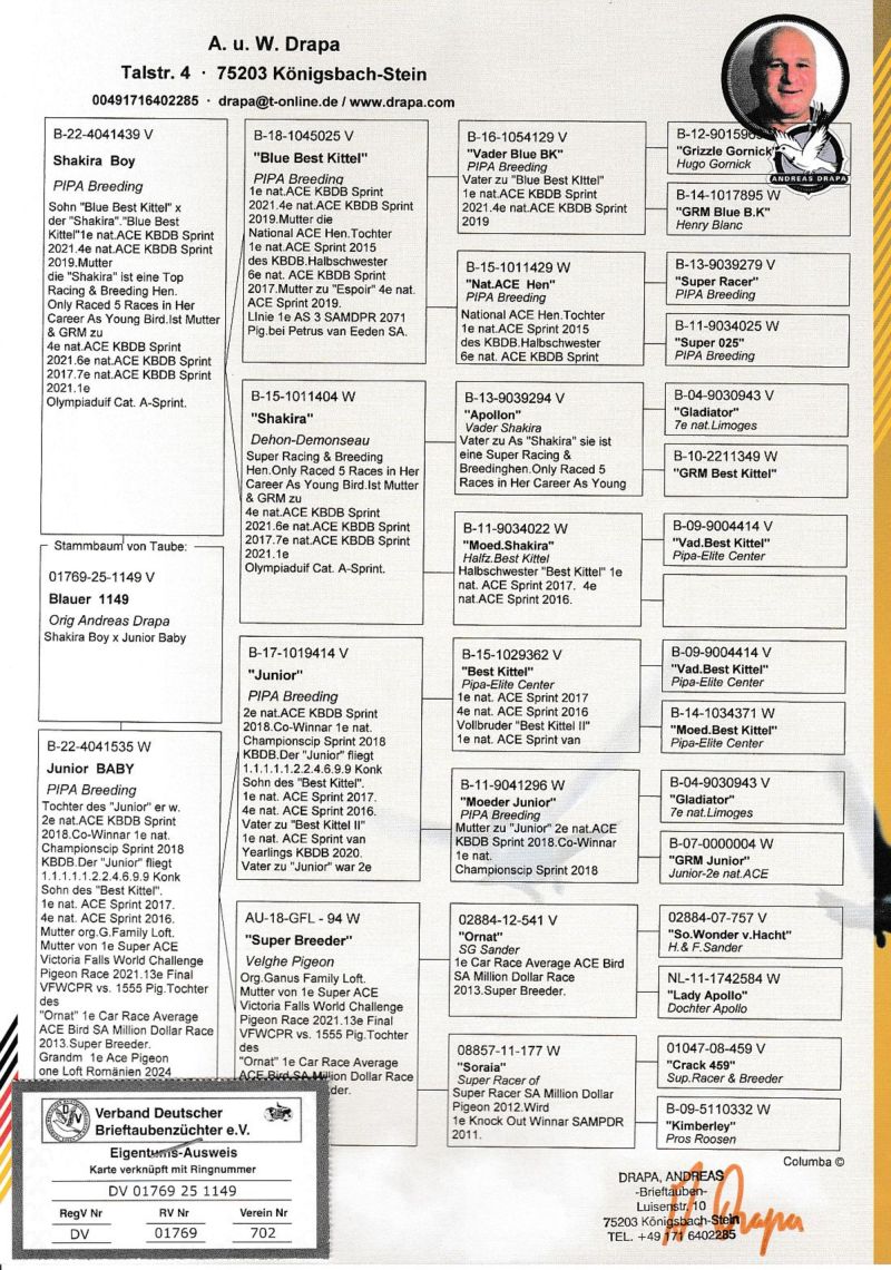 UWAGA PODBICIE NA TEJ AUKCJI WYNOSI 50 ZŁ Oryginalny gołąb z hodowli Andreasa Drapy. Szczegóły pochodzenia w rodowodzie. Oferowany gołąb to prawodopodobnie SAMIEC. Gołąb jest własnością Andreasa Drapy i znajduje się już w Polsce u kolegi Roberta Grochowskiego. Gołębia można obejrzeć w Urbanowicach woj. opolskie, po wcześniejszym kontakcie telefonicznym. Sprzedający może zorganizować transport gołębia. Koszt przesyłki do najbliższego większego miasta obok miejscowości kupującego to około 70-100zł. Więcej informacji pod numerem 600133330. Gołębie są zaszczepione w grudniu SALMOVIREM. SĄ TO OSTATNIE GOŁĘBIE Z ROCZNIKA 2025