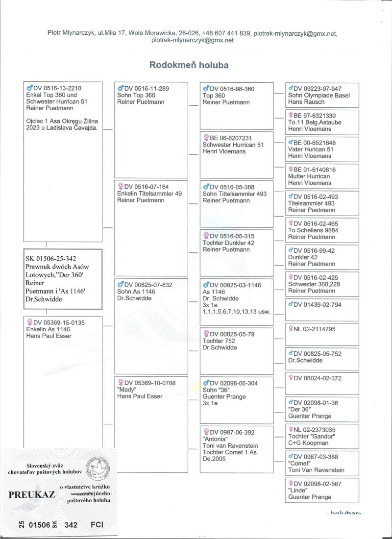 Prawnuk dwóch Asów lotowych "Der 360"Reiner Puetmann i"As 1146"Dr.Schwidde.Ojciec gołębia jest ojcem 1 Asa okregu Zilina 2023 u Ladislava Cavajda.Linia "Hurican 51"i "Comet". Matka oryg.Hans Paul Esser wnuczka "1146"Asa lotowego Dr.Schwidde.Gołąb zaszczepiony MSV i odrobaczony.Transport kurierem po uzgodnieniu,odbiór osobisty.