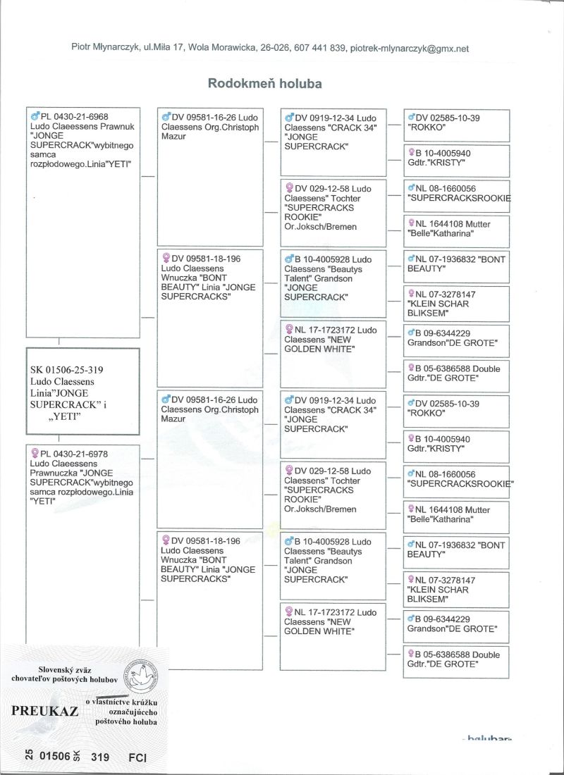 Ludo Claessens po oryginałach od Christoph Mazur. Linia 'Yeti" i "Jonge Supercrack". Gołąb zaszczepiony MSV i odrobaczony. Transport kurierem po wcześniejszym uzgodnieniu,odbiór osobisty.