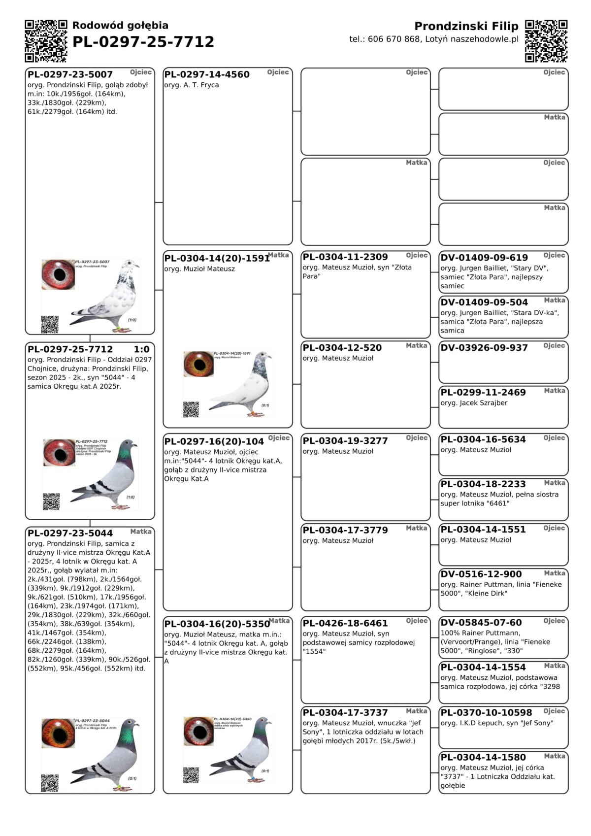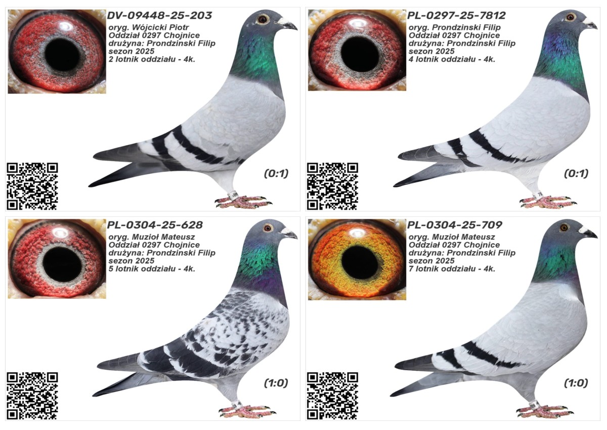 PLGP oryg. Prondzinski Filip - Oddział 0297 Chojnice, drużyna: Prondzinski Filip, sezon 2025 - 2k. Gołąb był lotowany w sezonie 2025 w Oddziale PZHGP 0297 Chojnice w drużynie Filip Prondzinski w ramach Polskiej Ligii Gołębi Pocztowych. Wyniki za poszczególne loty dostępne są w tabeli wyników. Zapewniamy transport gołębi w cenie: od 1 do 6 szt. - 150 PLN i od 7 do 12 szt. 200 PLN. Gołębia można również odebrać osobiście w Lotyniu lub w Tucholi. Więcej informacji u kol. Filipa Prondzinskiego pod nr tel.: 606 670 868.