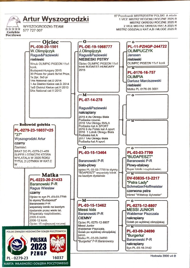 ORYGINALNY PL-0279-23-16037(25) plus gratis PL-0279-24-1168 *** WIĘCEJ INFORMACJI W RODOWODACH I POD NUMEREM TELEFONU 605-061-353 TOMEK ***