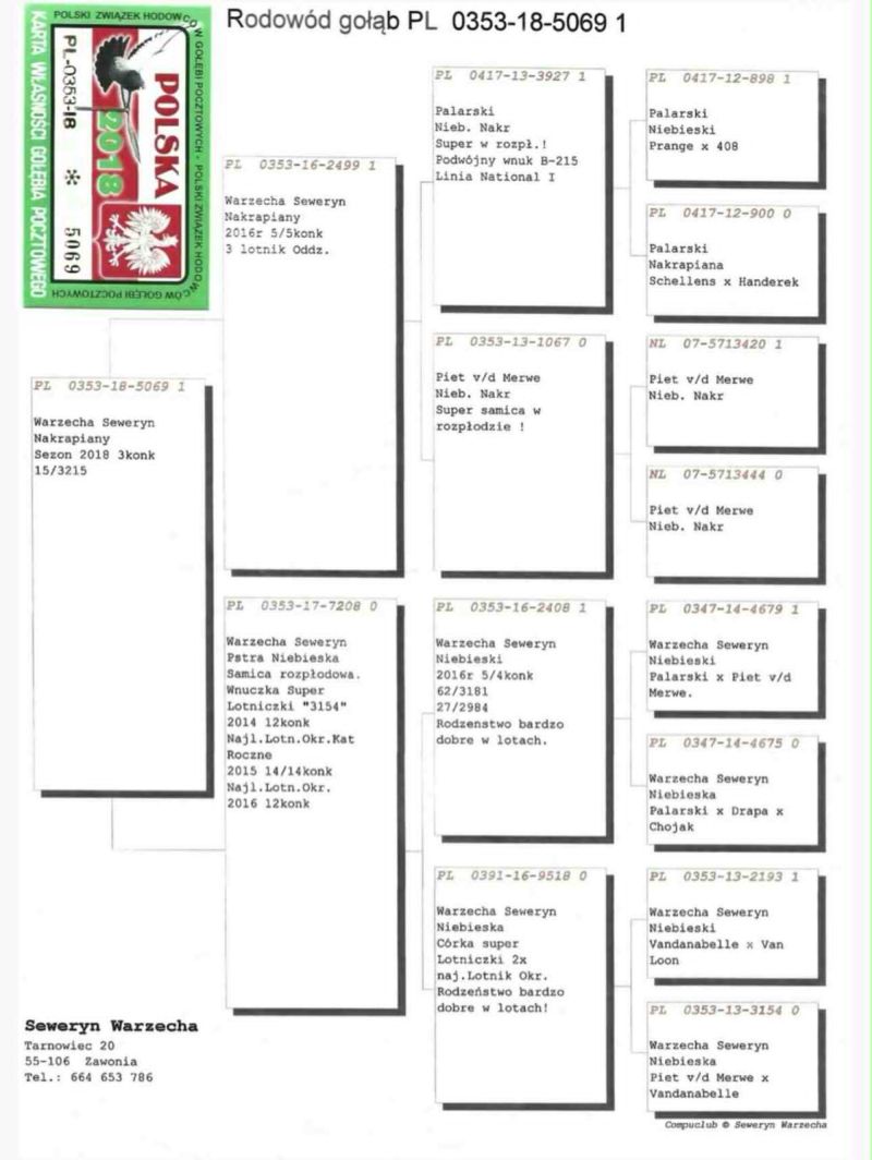 Oryginalny gołąb z hodowli Seweryna Warzechy linia Van De Merve oraz Dominik Palarski. Szczegóły pochodzenia w rodowodzie. Więcej informacji pod nr tel.: 728 218 882 *Możliwość wysyłki.