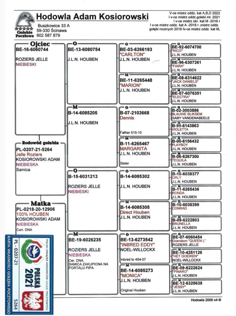 Oryginalny gołąb z hodowli Adama Kosiorowskiego Houben,Jelle Roziers . Szczegóły pochodzenia w rodowodzie. Więcej informacji pod nr tel.: 728 218 882 *Możliwość wysyłki.