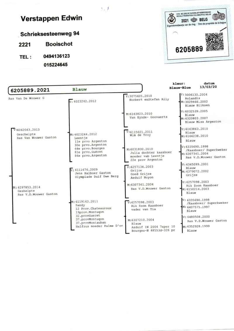 BE-21-6205889 - oryg. Verstappen Edwin - 100% Gaston Van De Wouwer - Inbred KAASBOER