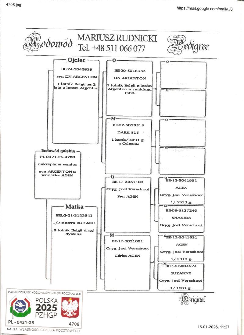 Matka Joel Verschoot, podwójna wnuczka AGEN- 1 narodowy konkurs Agen na 5283 goł. i wnuczka SUZANNE- 1/ 1661 g. Ojciec syn DN ARGENTON- 1 lotnik Belgii z lotów Argenton. Szczegóły pochodzenia w rodowodzie i pod nr tel. 696 241 555