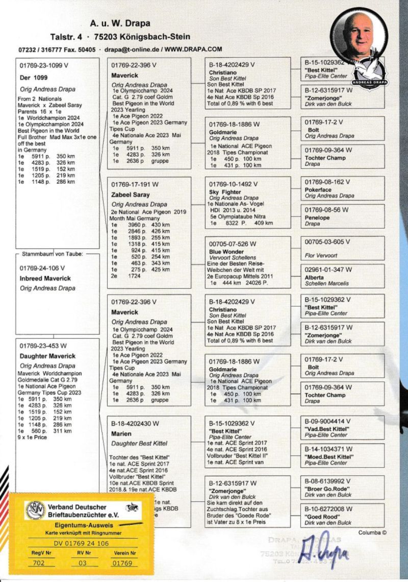Oryginalny gołąb z hodowli Dariusz Janas . Szczegóły pochodzenia w rodowodzie . Więcej informacji pod nr. tel . 502581334 .... Wystawiany gołąb to prawdopodobnie samiec......... koszt transportu do 3 szt. 120 zł. 150zł. w zależności od kuriera.