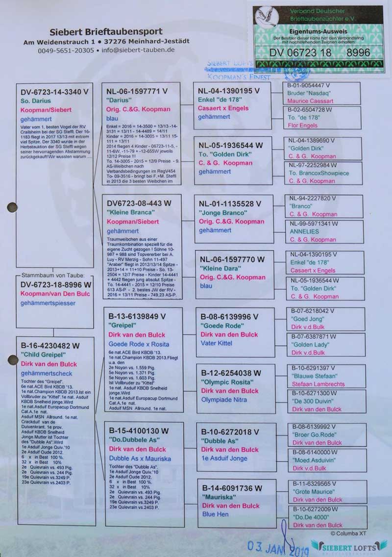 DV-06723-18-8996 oryg. Siebert Brieftaubensport - wnuczka "Greipel" Dirk van den Bulck - Adam Moskal .:KOTEK:.