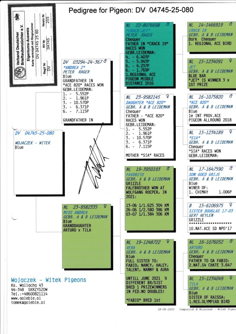 KOSZT TRANSPORTU 120 ZŁ (maksymalnie 3 gołębie w jednej paczce). KOSZTA ZA GOŁĘBIA I TRANSPORT KLIENCI BĘDĄ PŁACIĆ BEZPOŚREDNIO KIEROWCY KTÓRY PRZYWIEZIE GOŁĘBIE. Gołąb z hodowli WOJACZEK-WITEK. Szczegóły pochodzenia w rodowodzie. Kontakt w sprawie gołębi oraz transportu pod numerem telefonu +48 600 821 114