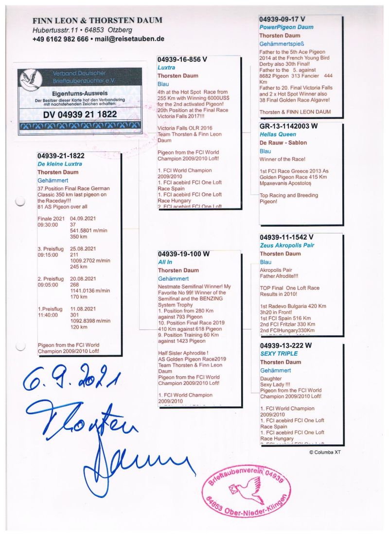 DV-04939-21-1822 *** LUXTRA x ALL IN, TOP OLR!!! 37. gołąb z FINAŁU GERMAN CLASSIC !!!!! Oryg. Finn Leon & Thorsten Daum *** KUP TERAZ ***