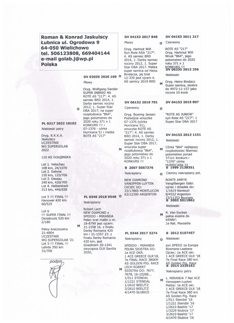 ***** UWAGA ***** !!!!! Możliwy odbiór osobisty lub dostawa realizowana przez kuriera w cenie 160 zł !!!!! Oryginalny gołąb z hodowli Romana & Konrada Jaskulskich. Szczegóły pochodzenia w rodowodzie. Gołąb gotowy do sezonu lęgowego, zaszczepiony przeciwko paramyksowirozie (Columba) i salmonellozie (Salmo PT). Więcej informacji pod nr tel.: 669 404 144. Wpłata za gołębia na konto po zakończeniu aukcji. Możliwy odbiór osobisty lub dostawa realizowana przez kuriera w cenie 160 zł. *** ZAPRASZAMY RÓWNIEŻ NA INNE NASZE AUKCJE ***